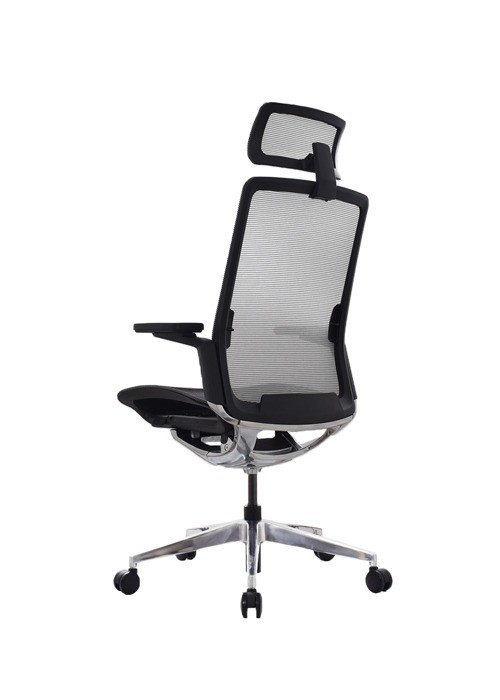 Silla giratoria con cabecero en malla, espaldar en malla poliester, apoyo lumbar regulable en altura por medio de tensión en la malla, brazos 4D, asiento en malla poliester,Mecanismo Syncro 3 bloqueos con slider, base de aluminio 70 cm, ruedas en goma 60mm.